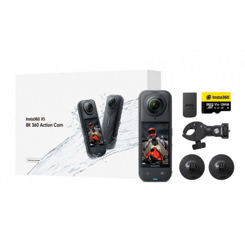Im Lieferumfang ist alles enthalten, was Sie für sofortige Aufnahmen benötigen: die Insta360 X5 Kamera, 128-GB-Speicherkarte, Heavy Duty Clamp, austauschbare Linsen, USB-Kabel, Tragetasche und Zubehör für eine sichere Befestigung der Kamera.