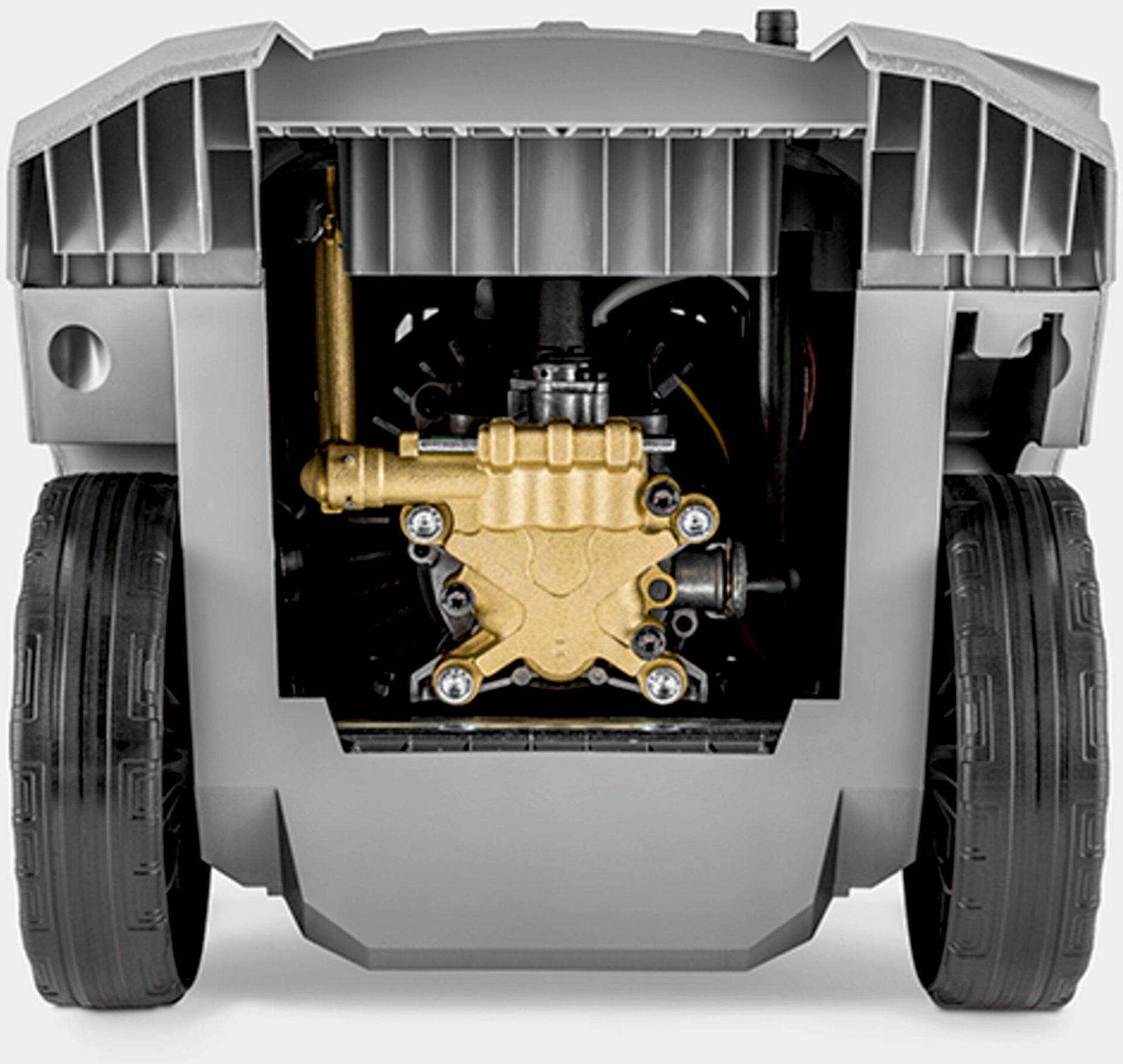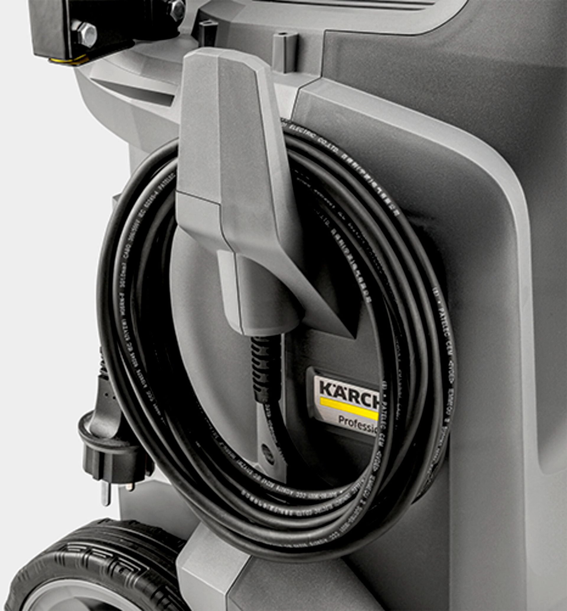 Integrierte Düsenhalter, Handtrommel für den Schlauch und Kabelhaken ermöglichen eine geordnete und praktische Aufbewahrung des Zubehörs.