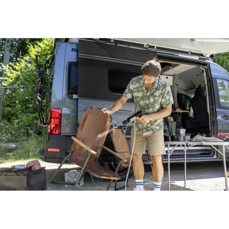 Der OC Handheld Compact eignet sich ideal für die Reinigung von Fahrrädern, Garten- und Campingausrüstung, Hunden oder Flecken am Auto. Der Akku kann über USB-C geladen werden, sodass flexibles Laden auch unterwegs möglich ist, z. B. im Auto oder über Powerbank. Eine Kompatibilität mit Gartenschlauchanschlüssen besteht nicht.