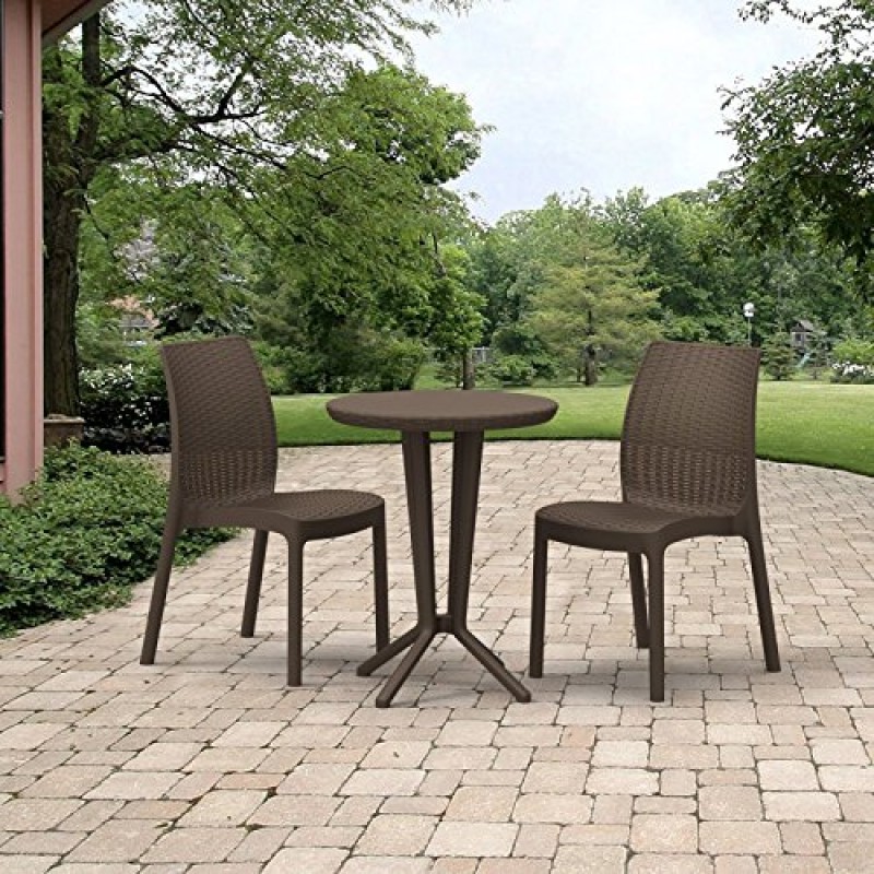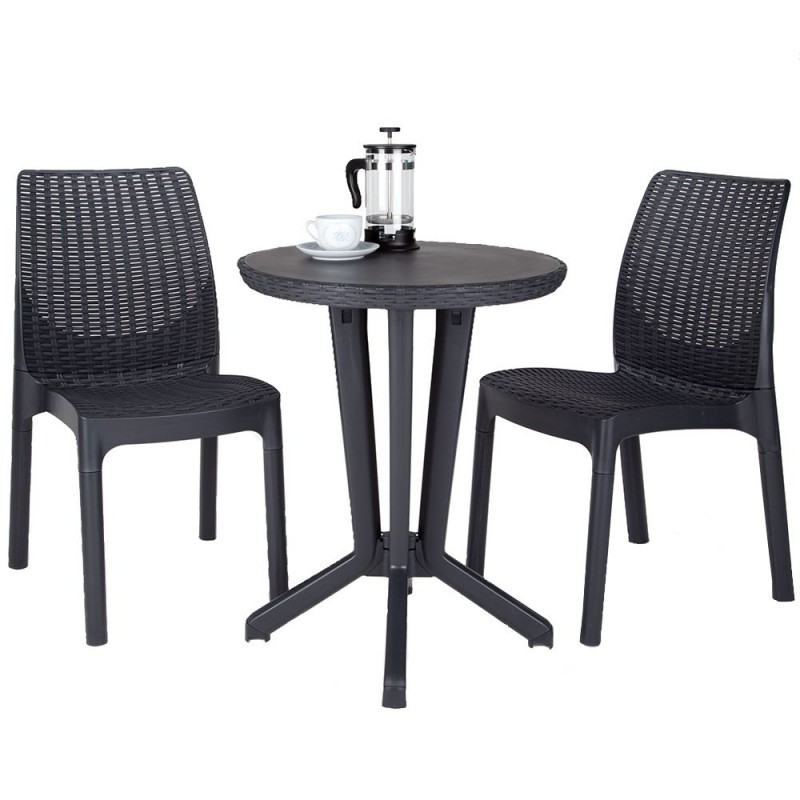 Keter Bistro-SetStilvolles, anthrazitfarbenes Bistro-Set von Keter bestehend aus einem Bistrotisch und zwei Bistrostühlen in moderner Rattan-Optik. Sitzflächen, Rückenlehnen und Tischplatte bestehen aus einem witterungsbeständigen Vollkunststoff.