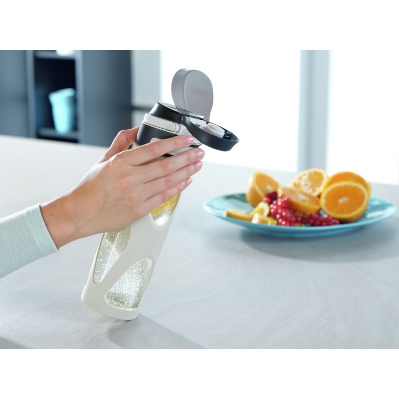 Bequem überall trinken – selbst wenn gerade nur eine Hand frei ist. Das ist kein Problem mit der Trinkflasche Flip 600 ml aus Glas von Leifheit. Denn wer diese kauft, der kann sie mit nur einer Hand automatisch per Knopfdruck öffnen. Lästiges Abstellen der Flasche ist so nicht mehr nötig. Selbstverständlich ist diese nicht nur komfortabel bedienbar, sondern ebenfalls zu 100 % auslaufsicher. Denn der Deckel mit Schraubverschluss schließt dicht ab. Zudem ist er verriegelbar und kann sich nicht versehentlich öffnen. Deshalb kann die Trinkflasche bedenkenlos in der Tasche mitgenommen werden. Besonders praktisch ist zudem der ausklappbare Henkel, der komfortables Tragen ermöglicht. So eignet sich die Trinkflasche auch ideal für Kinder oder zum Sport. Zudem kann sie dank des Henkels ebenfalls an Rucksäcken oder Schulranzen befestigt werden. Da die Flasche frei von BPA sowie anderen Schadstoffen ist und aus hitzebeständigem Glas besteht, kann sie mit kalten sowie heißen Getränken bis zu 65 °C befüllt werden. Dank des im Deckel der Trinkflasche Flip 600 ml aus Glas enthaltenen abschraubbaren Filters können Obst oder Kräuter hinzugefügt werden, ohne beim Trinken zu stören. Vor Hitze und Glasbruch schützt die Silikonummantelung der Flasche. Dank dieser liegt sie außerdem gut in der Hand. Weiterhin befindet sich am Deckel eine Soft-Grip-Oberfläche, um die Trinkflasche einfacher aufdrehen zu können. Die Trinkflasche aus Glas ist erhältlich in sieben verschiedenen Trendfarben.