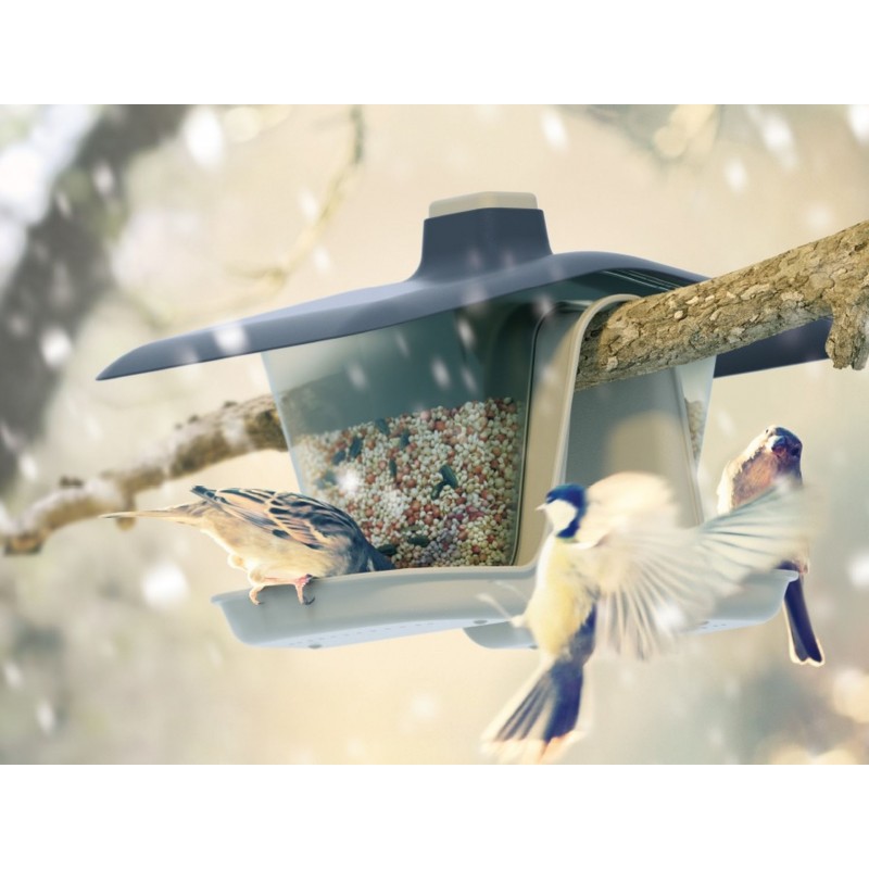 Vogelhaus Birdyfeed Square mit einem großen Getreidebehälter für Körner in verschiedenen Größen. Das geneigte Dach schützt die Lebensmittel vor Regen. Die Vogel-Futterstelle kann am Baum aufgehängt werden. Dank einer Kunststoffklemme kann die auch auf einem Geländer oder einem Ast befestigt werden.Technische Details: