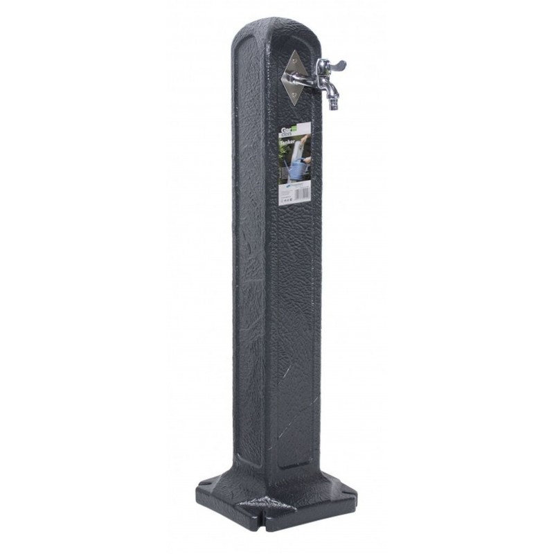 Wasser-Entnahmestelle mit Wasserhahn in Steinoptik. Die ca. 91 cm hohe Wasserzapfsäule in ansprechender anthrazitfarbener Steinoptik ermöglicht es, ganz bequem und leicht die Gießkanne mit Wasser zu füllen oder für andere Zwecke direkt im Garten Wasser zu zapfen. Die ca. 12 cm2 messende Zapfsäule kann an jeder gewünschten Stelle im Garten mittels Verschraubung der ca. 24 cm2 großen Fußplatte am Untergrund oder Einbettung in der Erde aufgestellt werden. Die Wasserzufuhr erfolgt über handelsübliche Schlauchstecksysteme. Der Schlauch wird an der Rückwand unten angesteckt. Durch den vormontierten Auslaufhahn kann ganz leicht das Wasser gezapft werden. Dank des Qualitätskunststoffs, aus dem die Wassersäule gefertigt ist, ist die Wassersäule UV- und witterungsbeständig.