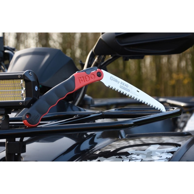 Wenn Sie die F180 nicht verwenden, können Sie sie einfach zusammenklappen mit dem Verriegelungshebel. Die scharfen Zähne sind sicher abgedeckt, da sie vollständig im Griff verborgen sind. Zum Öffnen kann die Säge einfach über die Kerbe in der Klinge ausgeklappt werden, auch mit Handschuhen. Mit dem Verriegelungsmechanismus lässt sich die Klinge sicher in zwei Positionen fixieren.