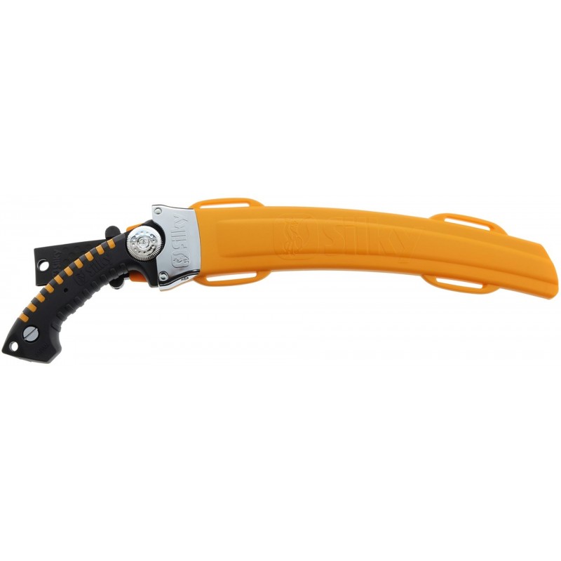Der komfortable Gummigriff absorbiert Vibrationen und bietet selbst bei Feuchtigkeit, Kälte oder mit Handschuhen einen sicheren Halt. Der gelbe Köcher ist gut sichtbar und kann mit Silky Gurten sicher am Körper befestigt werden.