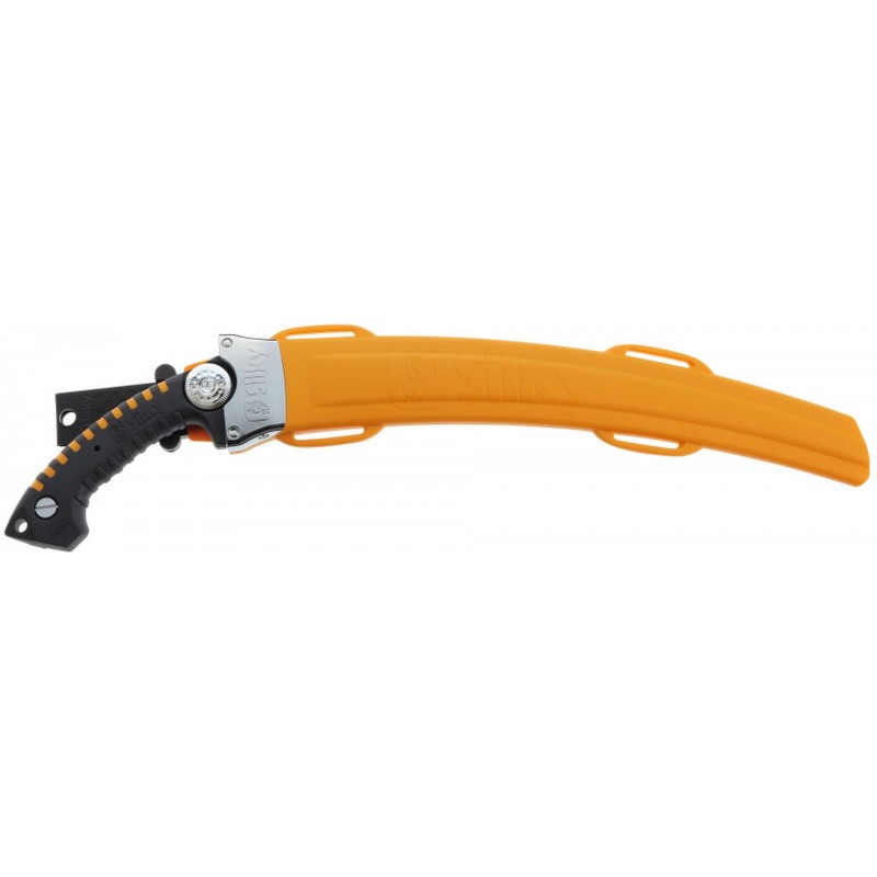Die Säge ist mit einem robusten Polypropylen-Köcher ausgestattet, der über eine abnehmbare Gürtelschlaufe sowie interne Rollen verfügt, die das Sägeblatt und die Zähne schützen. Die Unterseite ist teilweise offen, sodass Feuchtigkeit und Sägemehl leicht entweichen können.