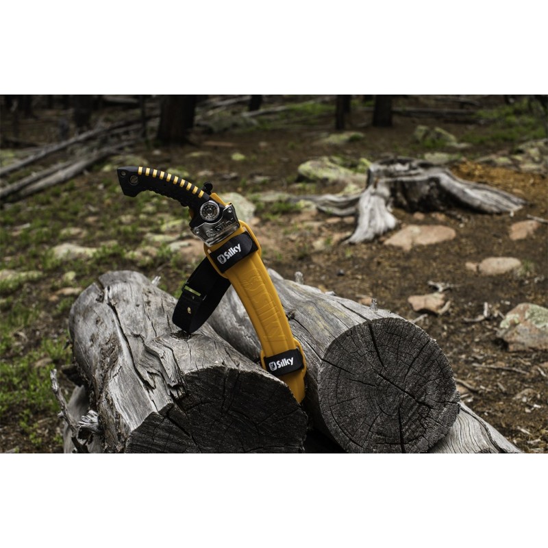 Der komfortable Gummigriff absorbiert Vibrationen und bietet selbst bei Feuchtigkeit, Kälte oder mit Handschuhen einen sicheren Halt. Der gelbe Köcher ist gut sichtbar und kann mit Silky Gurten sicher am Körper befestigt werden.