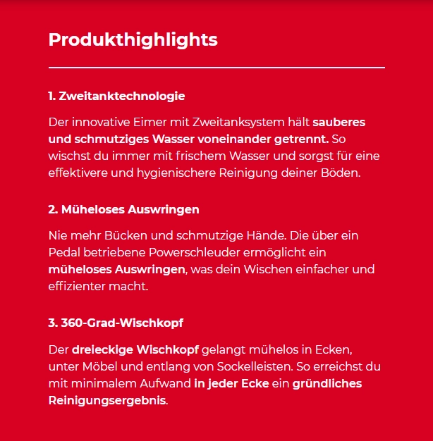 Das Vileda H2PrO Set hat einen innovativen Zweitank-Eimer, der dafür sorgt, dass sauberes und schmutziges Wasser voneinander getrennt bleiben – für eine effektivere Reinigung. Mit dem Auswringmechanismus, der durch das Fußpedal aktiviert wird, kannst du den Feuchtigkeitsgrad des Mopps leicht steuern.