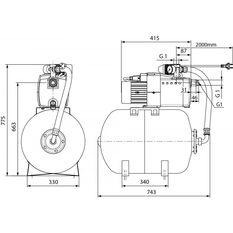 Das System verfügt über ein Membran-Druckgefäß mit robuster austauschbarer EPDM-Membran, die für konstanten Druck und lange Lebensdauer sorgt. Der Lieferumfang enthält außerdem einen Druckschalter, Manometer, flexible Druckleitung und eine elektrische Schnellkupplung. Der Motor besitzt einen PTO-Überlastschutz mit automatischem Reset.