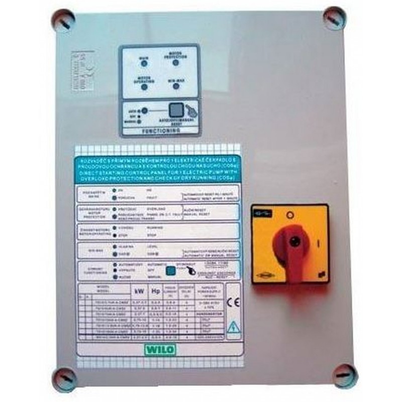 Schaltschrank für alle Einphasenpumpen . Dank seiner einzigartigen kontinuierliche Kontrolle in vollem Umfang schützt die Pumpe gegen Trockenlauf und vor Überlastung. Dadurch entfällt die anspruchsvolle Montageelektrodeneinrichtung .Das Gehäuse ist mit einem Hauptschalter ausgestattet.